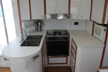 Respite has ample room for guests and passengers. The spacious main saloon* seats seven comfortably at the table. The saloon windows provide a panoramic view of the surroundings, and, unlike many sailing yachts, there is ample headroom in Respite’s saloon. The saloon features a large, LED TV, a sweet stereo, an Xbox and a computer. The galley is well appointed with a double sink, a gas, three-burner stove and oven, microwave, toaster oven and, most importantly, a coffee maker (Captain Rod is a coffee snob). Oh, there is also a huge refrigerator and freezer to keep your beverages icy cold.