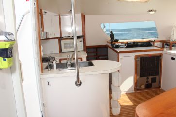A large guest berth is located aft in the starboard hull. It has a queen-sized bed and plenty of storage. A smaller guest berth is located forward in the starboard hull. It has a twin sized bed and ample storage. The two guest berths share a head and shower that is located slightly forward of amidships in the starboard hull.