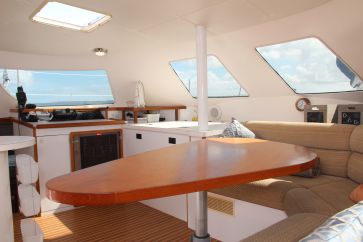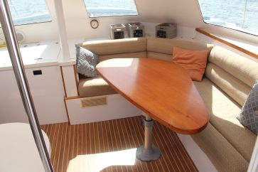 Respite has three berths. The owner’s suite occupies the port hull. The owner’s berth is aft, with a queen-sized bed and plenty of storage. The owner’s head is forward, with full shower, wash basin and fresh-water electric head.